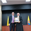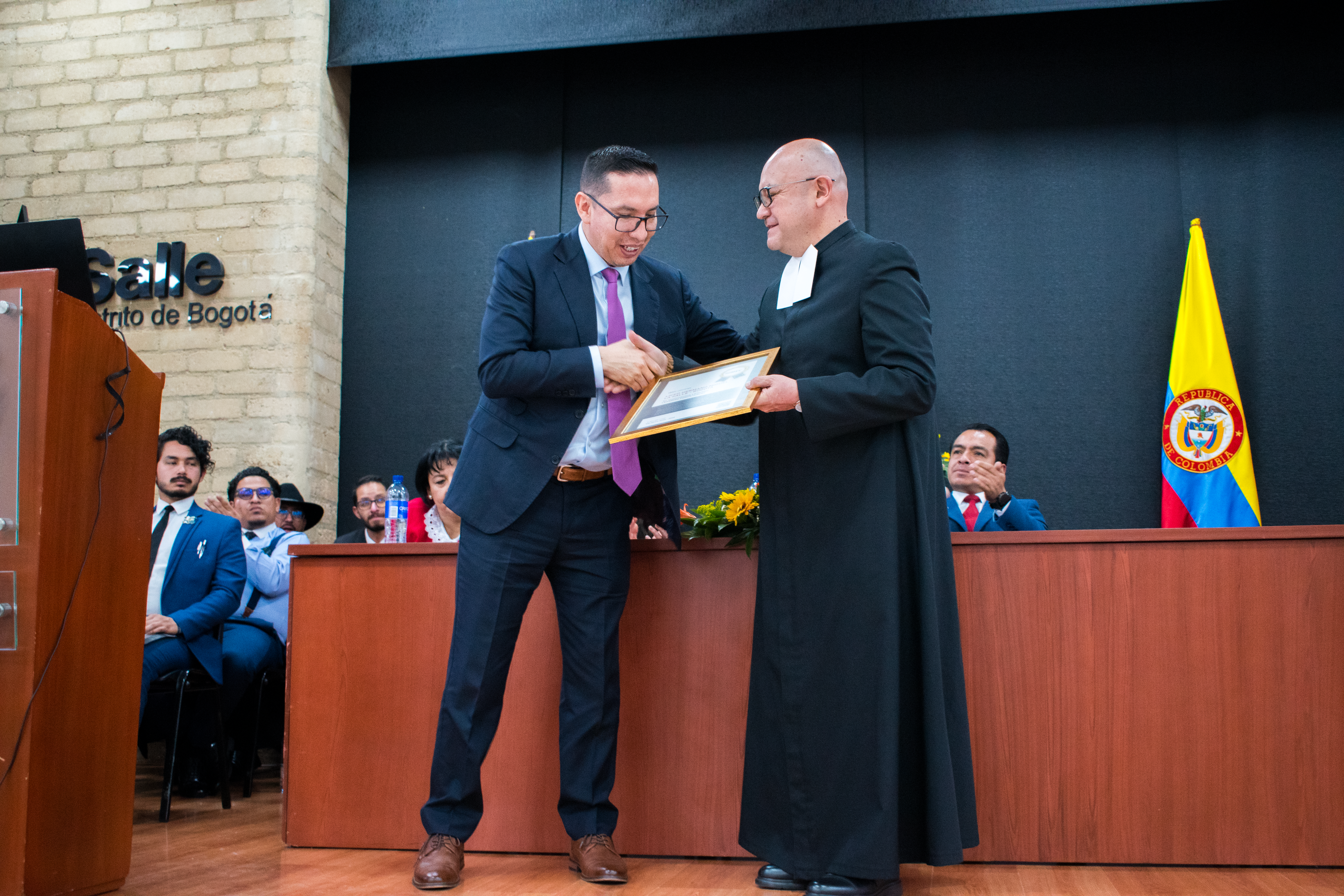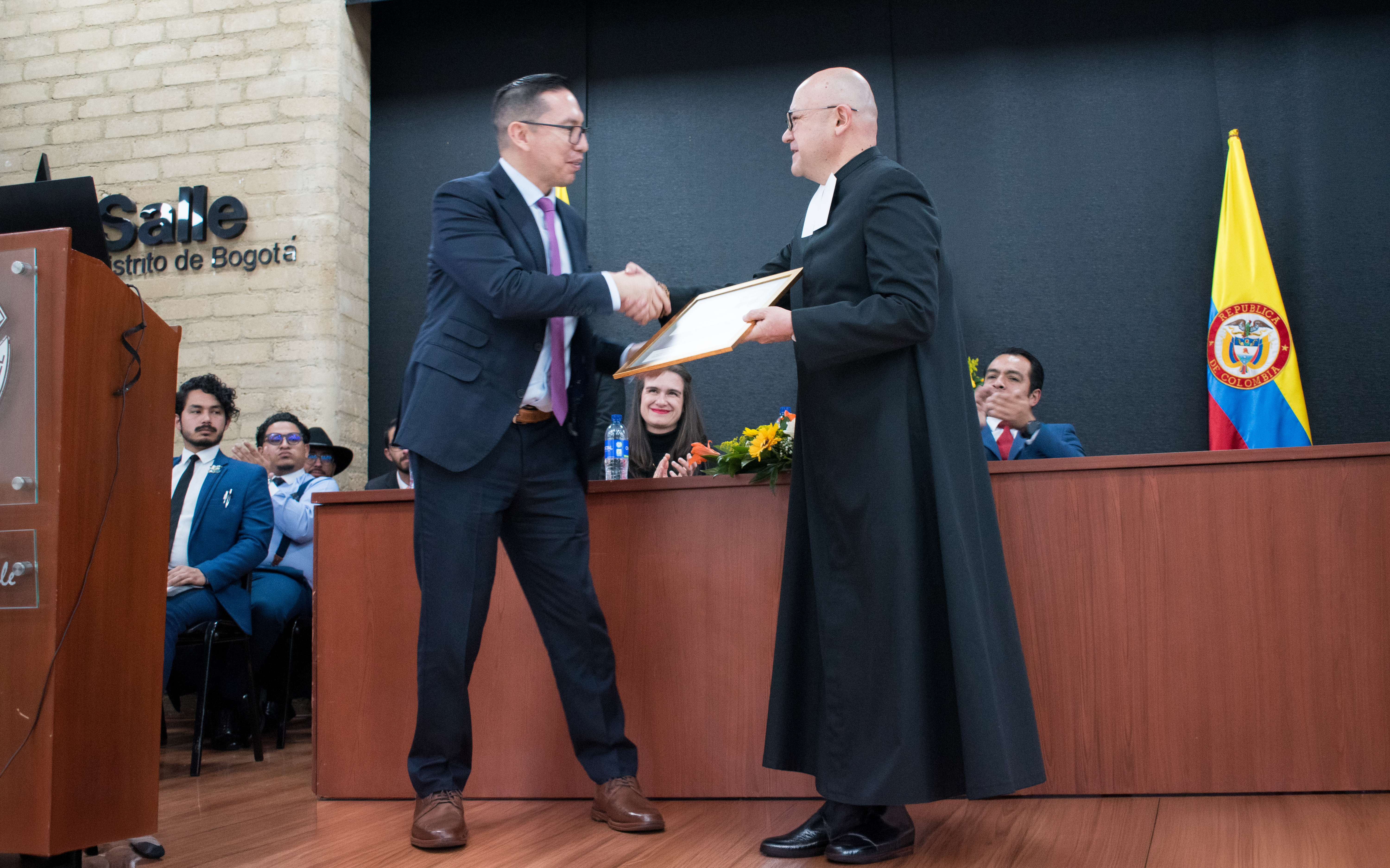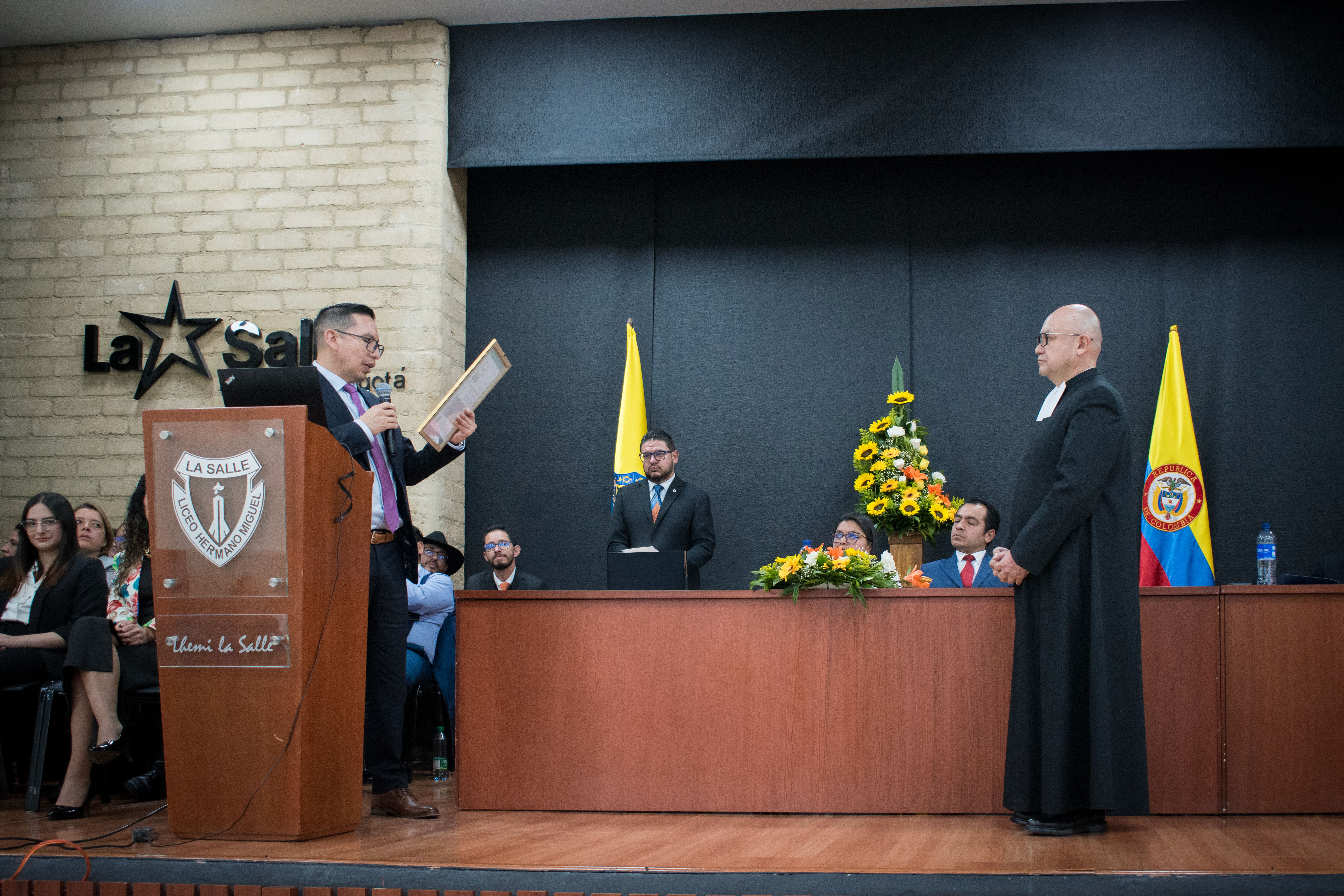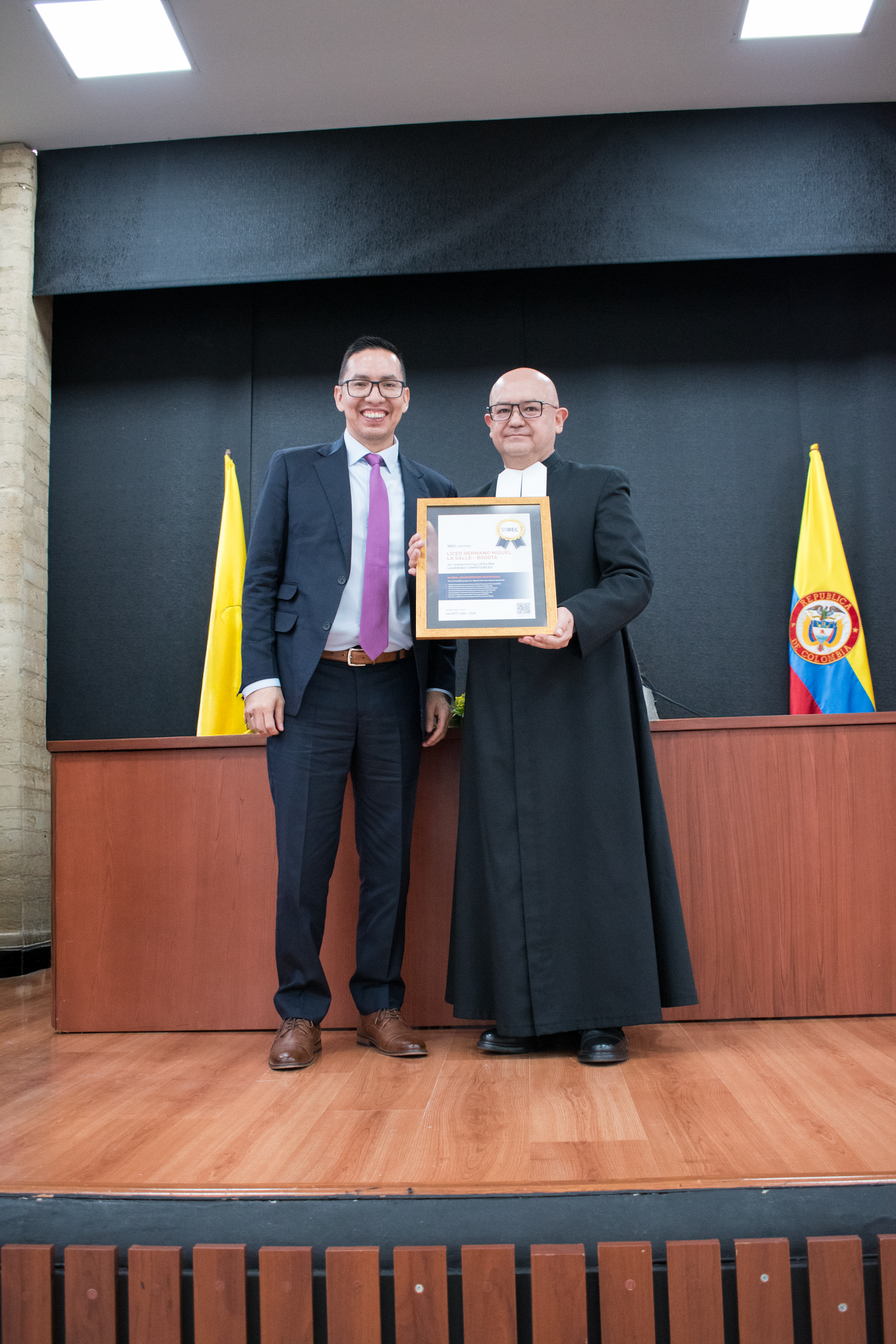 La entrega de la placa estuvo a cargo del MSc. Luis Peralta, Regional Manager de IBEC LATAM, y fue recibida por el Hno. Diego José Díaz Díaz, rector de la institución, marcando el inicio formal de implementación de estándares internacionales en el modelo formativo del colegio.